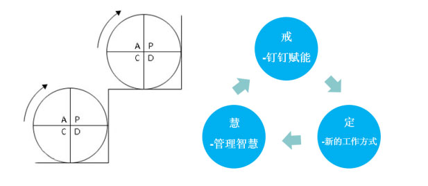 再通过计划、实施、检查、评估这个管理的环,不断的循环,一个个上台阶。结合钉钉,使信息的流动更为流畅,使这个环转得更快,更高效,从而让管理顺畅落地。